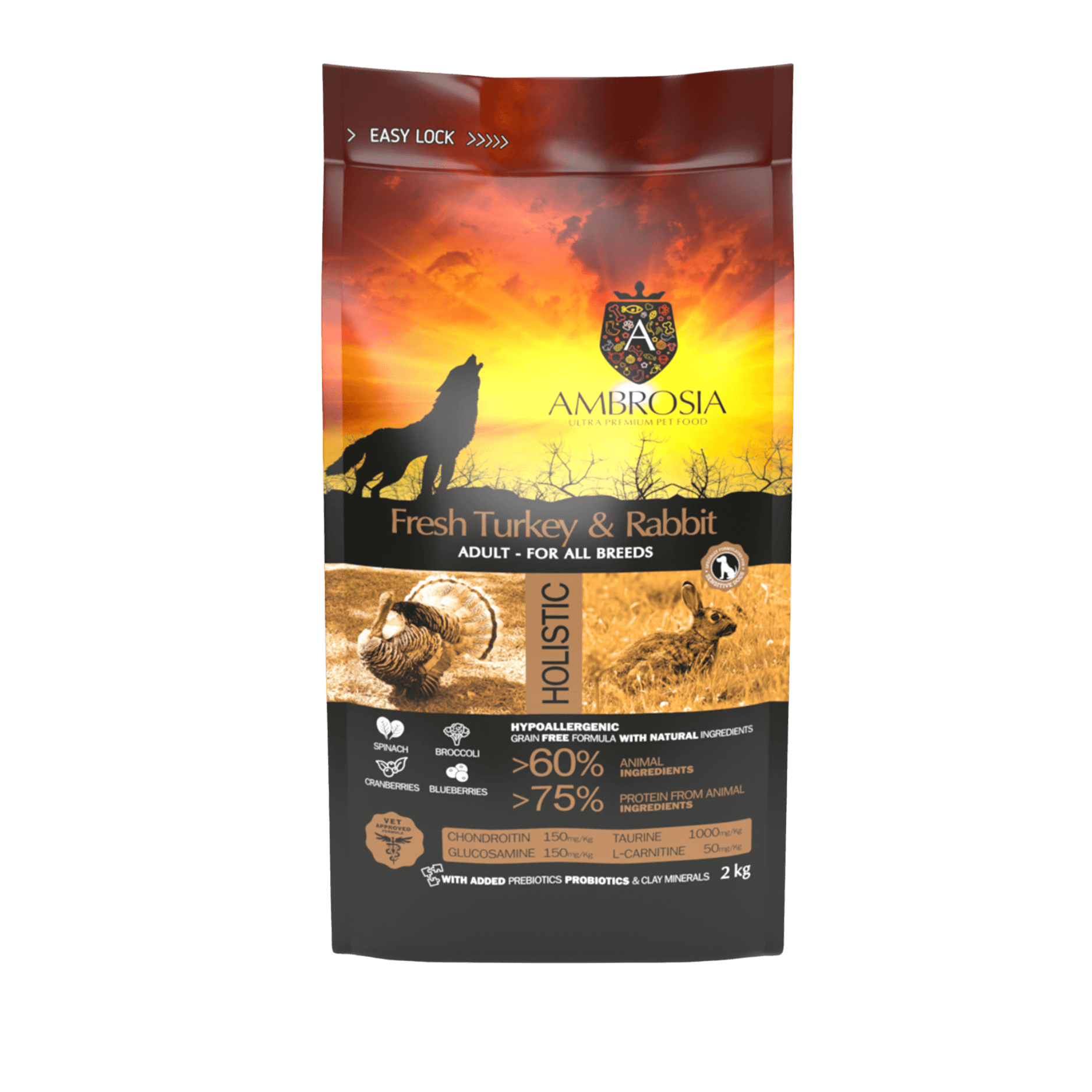 Ambrosia Nourriture sèche chien, Dinde fraîche et lapin, Sans grains, 2Kg