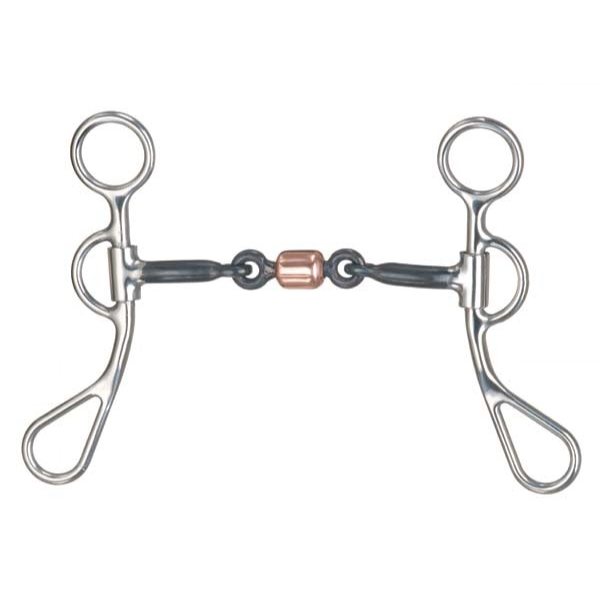 Canon brisé de 5" x ?" en fer doux lisse avec une brisure en forme d'os de chien et un rouleau en cuivre. Branches de 6". Le mors brisé en os de chien exerce moins de pression sur la langue et, grâce au cuivre, aide à détendre la bouche du cheval. Convient aux chevaux jeunes ou intermédiaires. Effet doux.