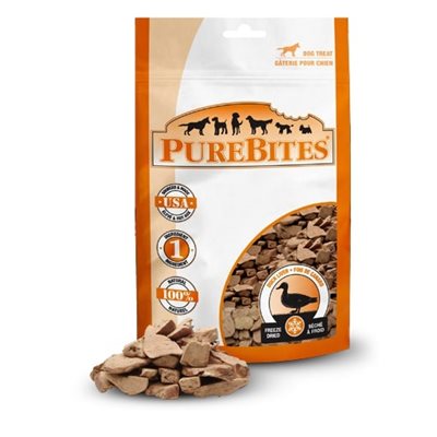 Les Gâteries PureBites® sont faites avec 1 seul ingrédient; du foie de canard élevé aux États-Unis pur et naturel à 100%. Les chiens raffolent du goût des PureBites®, car nos gâterie sont séchées à froid afin de sceller la saveur, la texture et la fraîcheur dont ils ont envie. Les propriétaires de chiens adorent les PureBites®, car nos gâteries sont pures à 100% et riches en nutriments pour une vie saine et heureuse. D'origine et fabriquées aux États Unis, elles sont élevées en protéine, hypoallergéniques et comptent environ 3 calories par gâterie. Le séchage à froid est une procédure délicate qui préserve la nutrition et la fraîcheur naturelle de la nourriture crue. Seulement l'eau est enlevée, ce qui aide à préserver la nutrition naturelle du foie de canard. Idéal pour les chiens dont la santé est problématique, telle que: l'embonpoint, le diabète, les allergies, les troubles gastro-intestinaux ainsi que la diète restreint